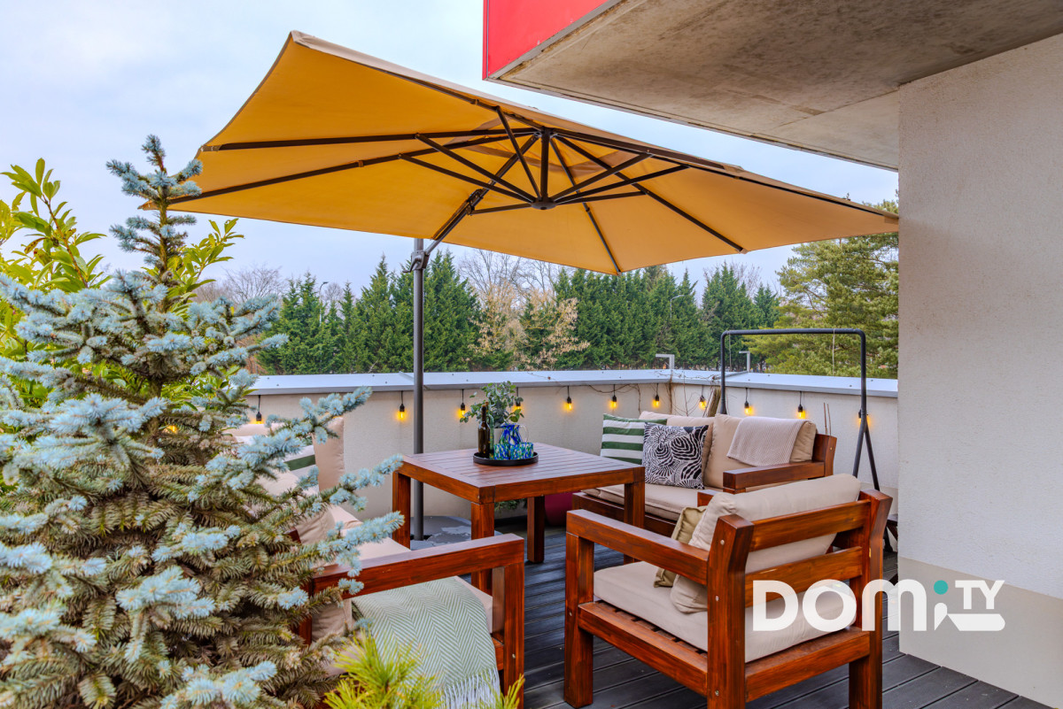 – duży ~40m2 prywatny taras wykończony deską tarasową, z oświetleniem i gniazdami elektrycznymi, idealny do spędzania wolnego czasu i relaksu,